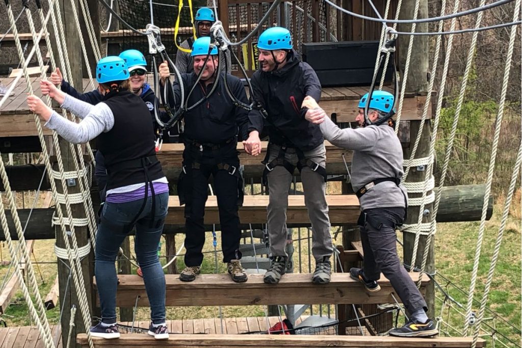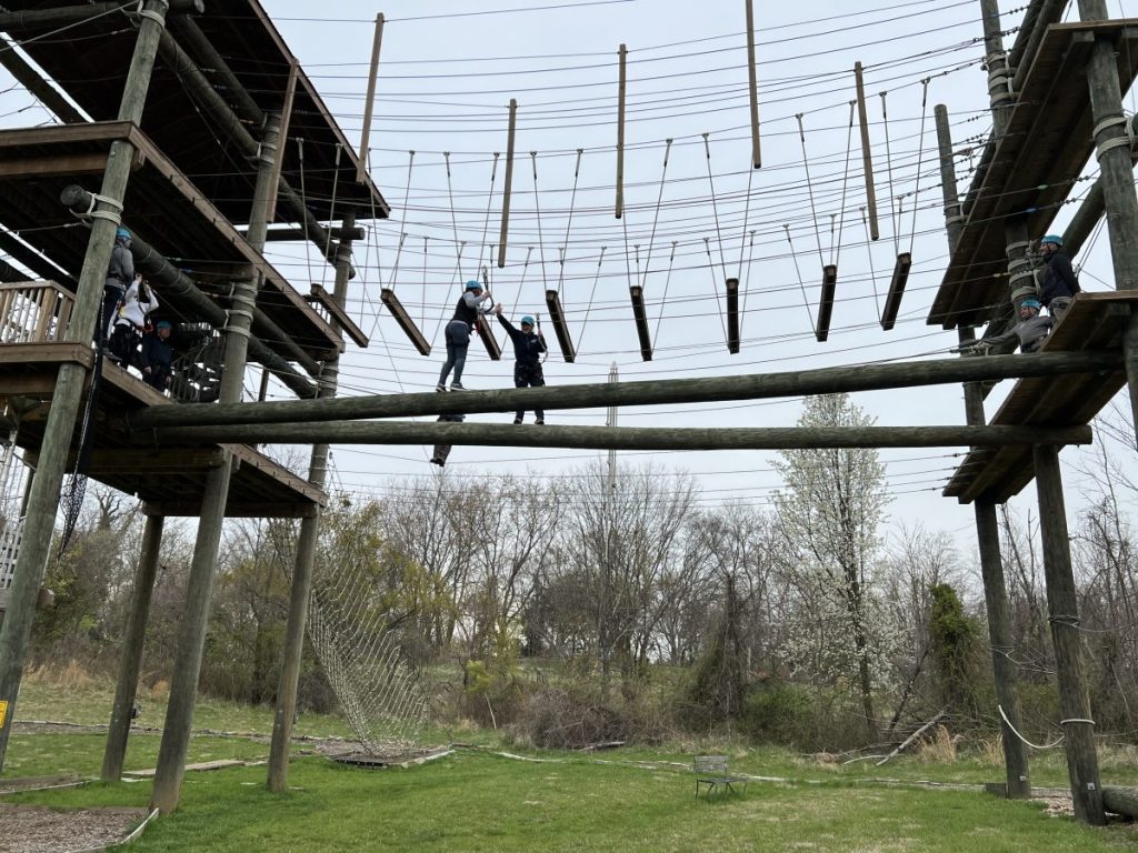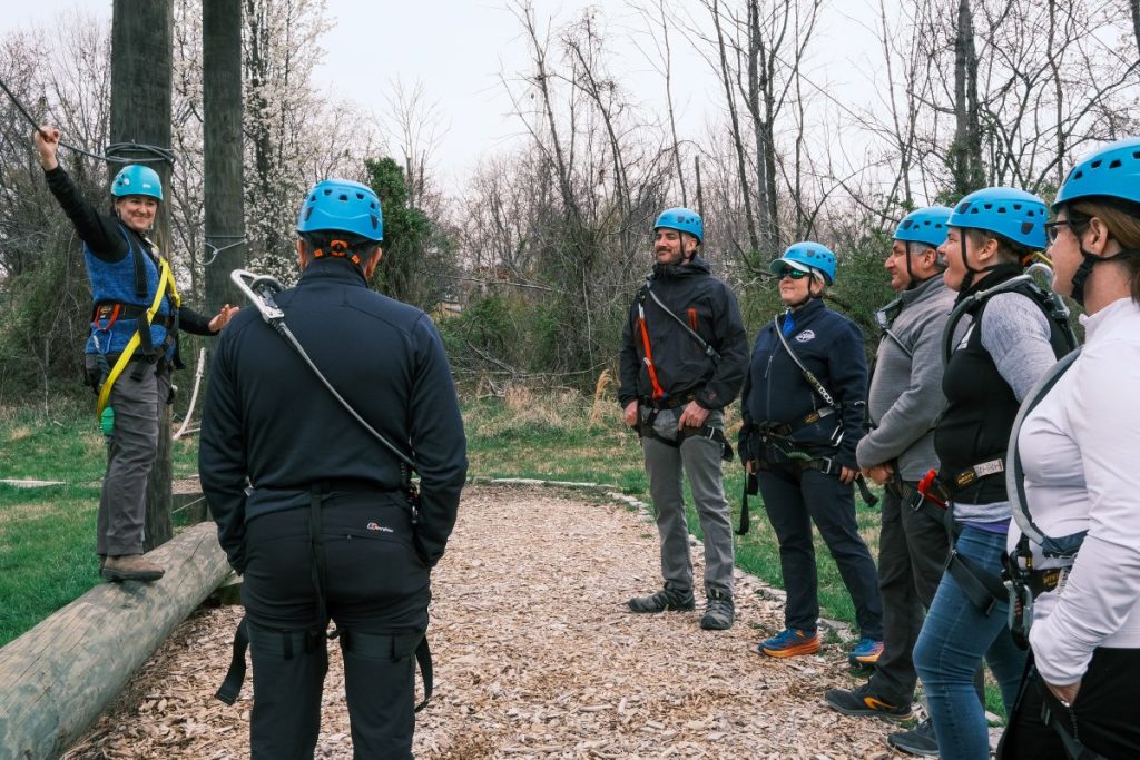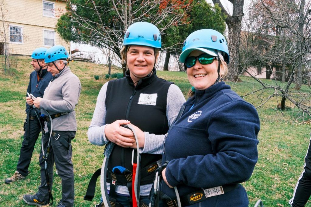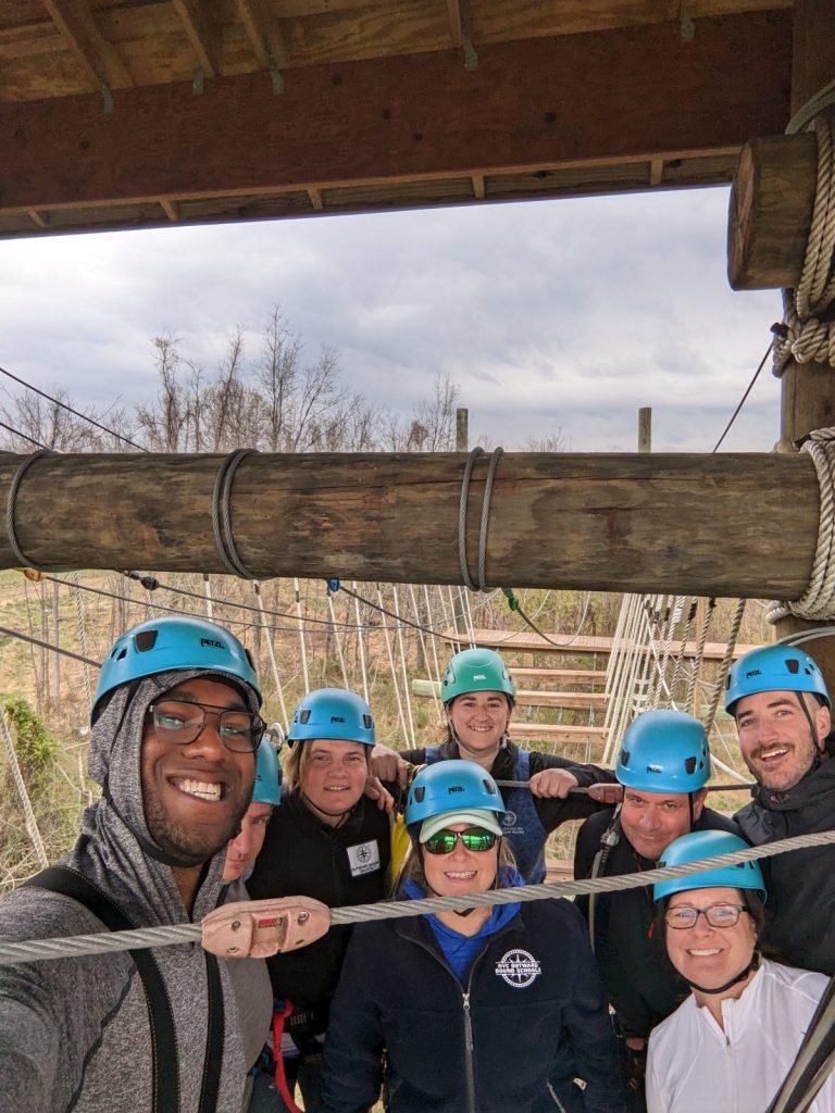 With Board and Committee meetings taking place at CBOBS’ Washington, DC campus, the visit also included time at CBOBS’ Baltimore campus to come together in teambuilding activities and to experience the nine-element high-ropes Aerial Teams Course (ATC). Located in Leakin Park, Baltimore City’s most extensive public city park, the ATC requires that groups work in collaboration as they traverse the aerial elements. For some, the experience was their first time on a high-ropes course.